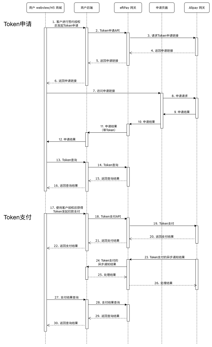 步骤1申请Token时最好绑定用户的信息,这样能有效避免在步骤20扣错款步骤6申请Token时需要用户进行一次支付,会在步骤13异步通知中返回Token,或者通过步骤16查询获取Token。注意步骤10中是不带Token的。步骤27(可选) 支付完成之后,商户会收到一个支付的异步通知结果,如果没有收到,需要通过步骤30主动查询