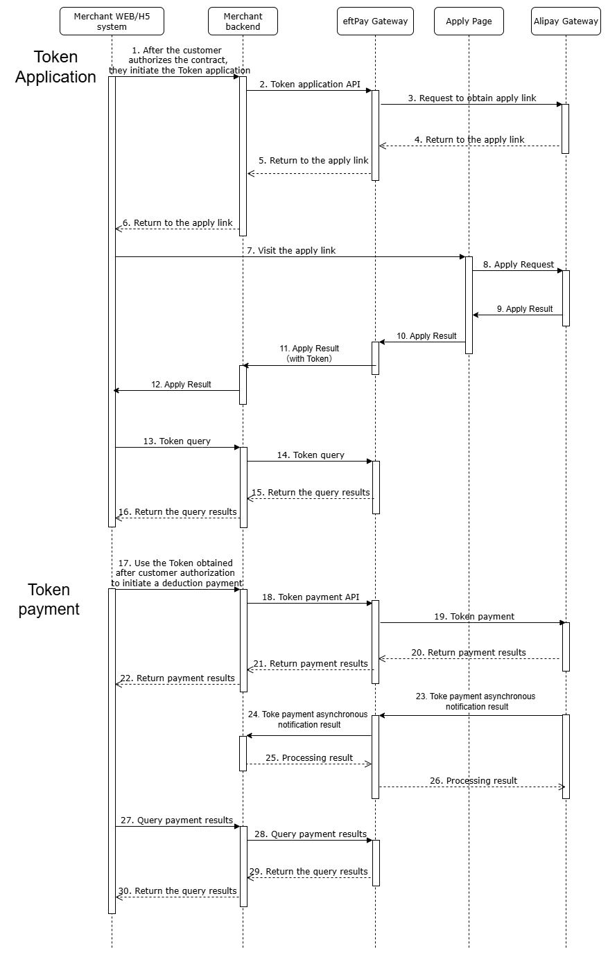 Step 1It is best to bind the user's information when applying for a Token, so as to effectively avoid incorrect deductions inStep 20.Step 6When applying for a Token, the user needs to make a payment, and the Token will be returned in the asynchronous notification inStep 13, or obtained by querying inStep 16. Note thatStep 10does not include the Token.Step 27(optional) After the payment is completed, the merchant will receive an asynchronous notification of the payment result. If it is not received, it needs to be actively queried throughStep 30.
